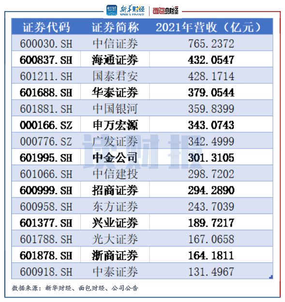 在已披露2021年年報的上市券商中,華林證券當年的營收同比下滑,其余券商的營收均有所增長。其中,中信證券、海通證券、國泰君安等8家大型券商的營收超過300億元。