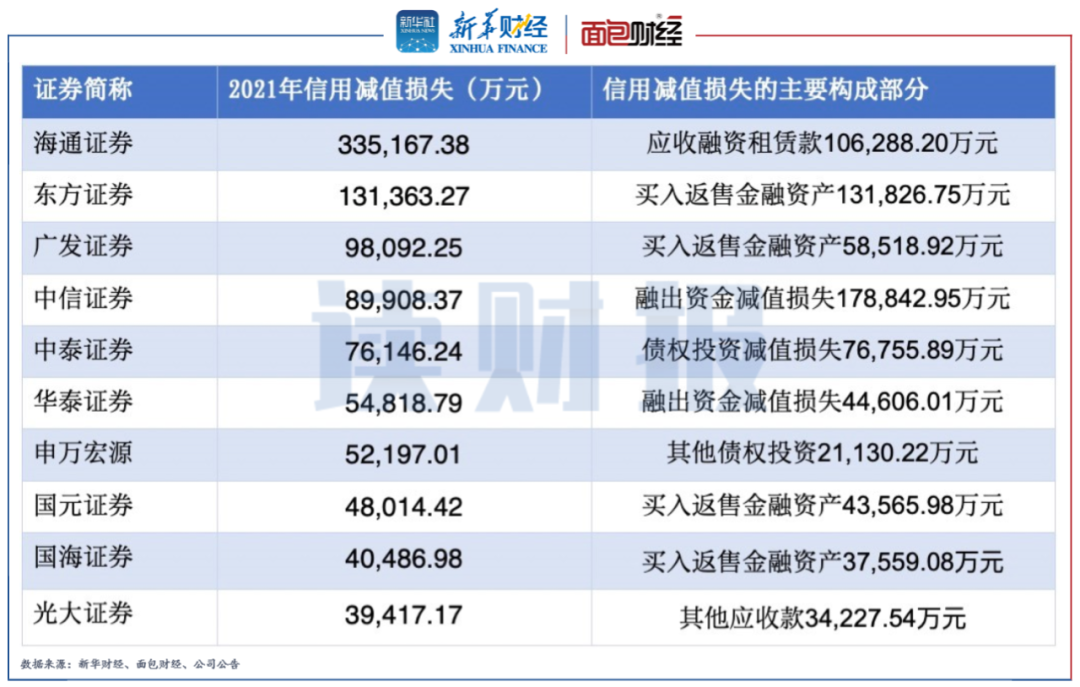 此外,海通證券、東方證券確認了超10億元的較大金額信用減值損失,主要源自應(yīng)收融資租賃款和買入返售金融資產(chǎn)。