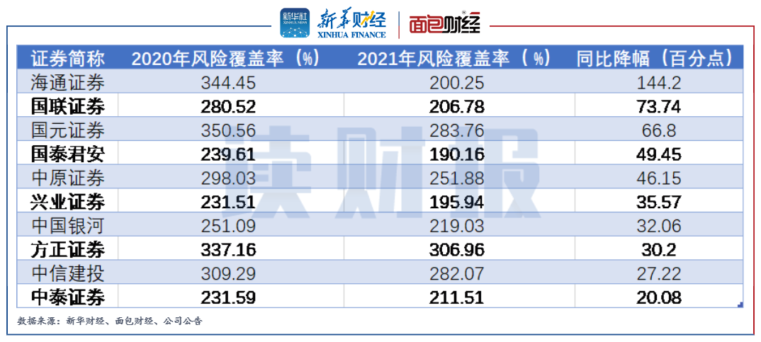 圖9:2021年風(fēng)險覆蓋率同比降幅較大的前十家上市券商