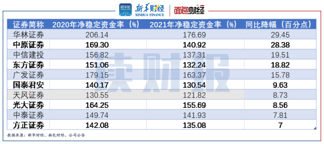 圖7:2021年凈穩(wěn)定資金率同比降幅較大的前十家上市券商