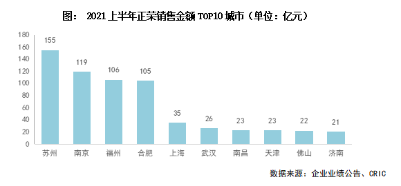 2021上半年正榮投資相對穩健,購地節奏較前期略有加快。期內于廈門、南京、無錫、西安等14個城市獲取24個項目,并首入杭州和廣州,新增土儲建面355.64萬平。土地成交價325.78億元,權益土地款同比增長19.4%至146.79億元,按金額計,權益拿地銷售比0.33,全口徑拿地銷售比升至0.4,高于TOP30同期均值0.34,但整體投資力度仍處40%的政策紅線內。