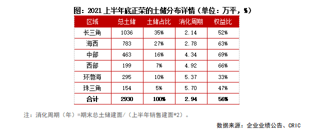 截至2021上半年底,正榮土地儲備2930萬平,權益建面比56%,總貨值約5100億元,保障未來2-3年的需求,去化周期適中。從各區域來看,62.1%的土地儲備集中于長三角和海西,兩大核心區域去化周期2-3年,與集團平均水平相匹配;而中西部、環渤海和珠三角土儲去化周期處4年以上,未來要加快以上區域項目的推盤和去化。