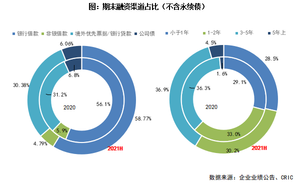 債務結構方面,從期限上來看,上半年成功發行兩筆期限為5年和5.5年債券,為正榮發行年限最長債券,通過以長換短的置換方式,期末長短債務比優化至2.5,其中5年以上有息債務占比較期初提升2.9pct至4.5%,1年內到期的短債占比改善至28.5%,短期流動性壓力不大。從渠道上來看,正榮減少對高息、期限短非標的依賴,非標依賴度從2020年的5.93%下降至期末的4.79%,低息銀行貸款占比較期初提升2.6pct至58.77%。