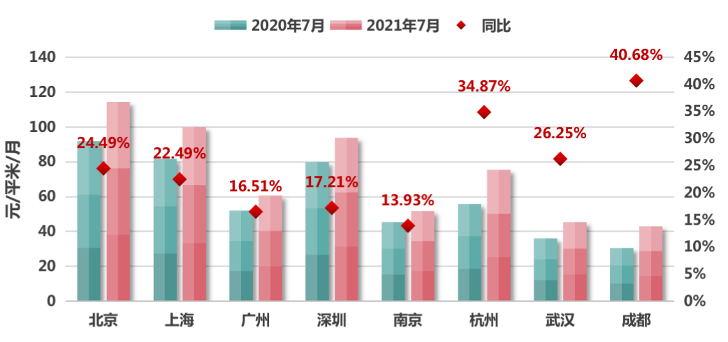 2021年7月核心八城個人房源租金及同比