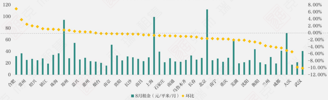 在一系列調控政策下,2021年8月,55城個人房源租金為33.67元/平米/月,環比下跌1.12%,隨著畢業旺季的逐漸消退,旺季效應開始減弱,租賃需求開始下降,租金開始止漲轉跌,進入傳統淡季。全國各地大力發展保障性租賃住房,這對于個人房源租金也有一定影響。