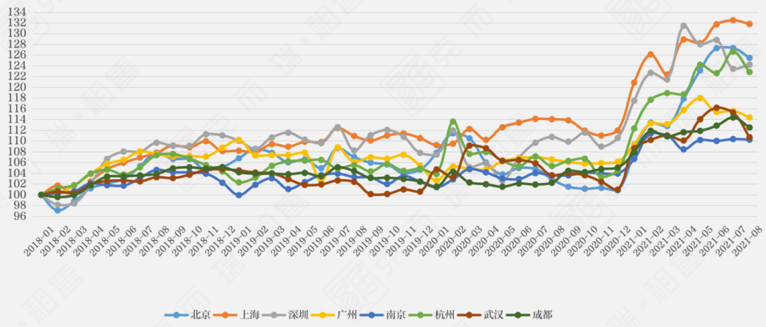 分城市來看,我們以2018年1月為基期,核心8城租賃價格指數出現下降。截至2021年8月,8城市租賃價格指數區間仍然位于97.09-132.5,城市間差異較大;上海租賃市場的發展的持續性和穩定性最好。廣州租賃市場近期表現較差,跌出第一梯隊。