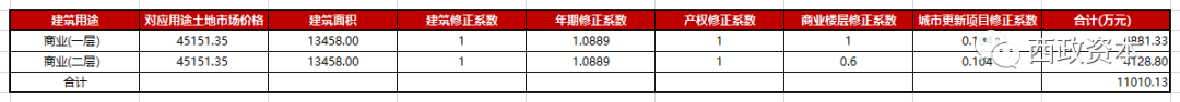 (5)商業用途項目修正系數=∑(各“用地類別或改造類型”面積占比×對應修正因子)=80.5%×0.081+19.5%×0.2=0.065+0.039=0.104
