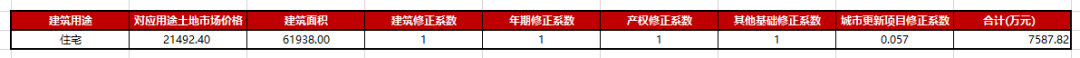 住宅地價=住宅用途土地的市場價格X建筑面積X建筑類型系數X年期系數X產權修正系數X城市更新項目修正系數=21492.4×(70334-8396) ×1×1×1×0.057=7587.82(萬元)