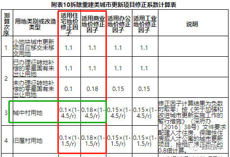 (2)計算住宅用途地價在城中村用地類型下的修正因子:0.1×(1-4.5/8.13)=0.1×(1-0.55)=0.045 ,住宅用途地價在歷史用地處置類型下的修正因子則通過查詢城市更新項目修正系數表直接按0.11確定。