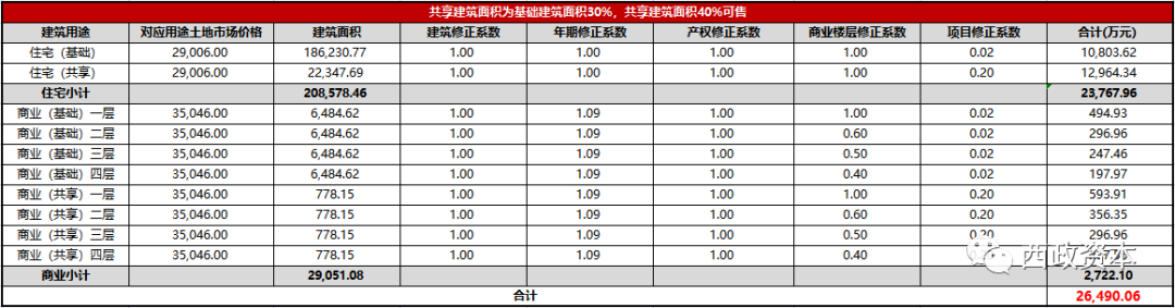 在此情形下,項目修正系數主要需按項目規劃基礎建筑面積和共享建筑面積進行區分。基礎建筑面積部分,規劃業態為商業、住宅的,項目修正系數為0.02,規劃業態為工業的,項目修正系數為0.01;共享建筑面積部分,規劃業態為商業、住宅的,項目修正系數為0.2,規劃業態為工業的,項目修正系數為0.01。