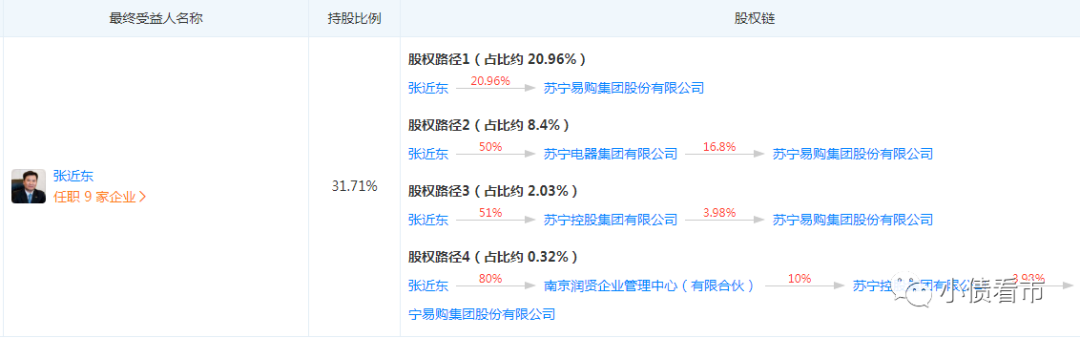 從股權結構上看,張近東直接持有蘇寧易購20.96%股份,他還通過蘇寧集團、蘇寧控股等路徑對公司間接持股,合計持有31.71%股份,為公司控股股東和實際控制人。