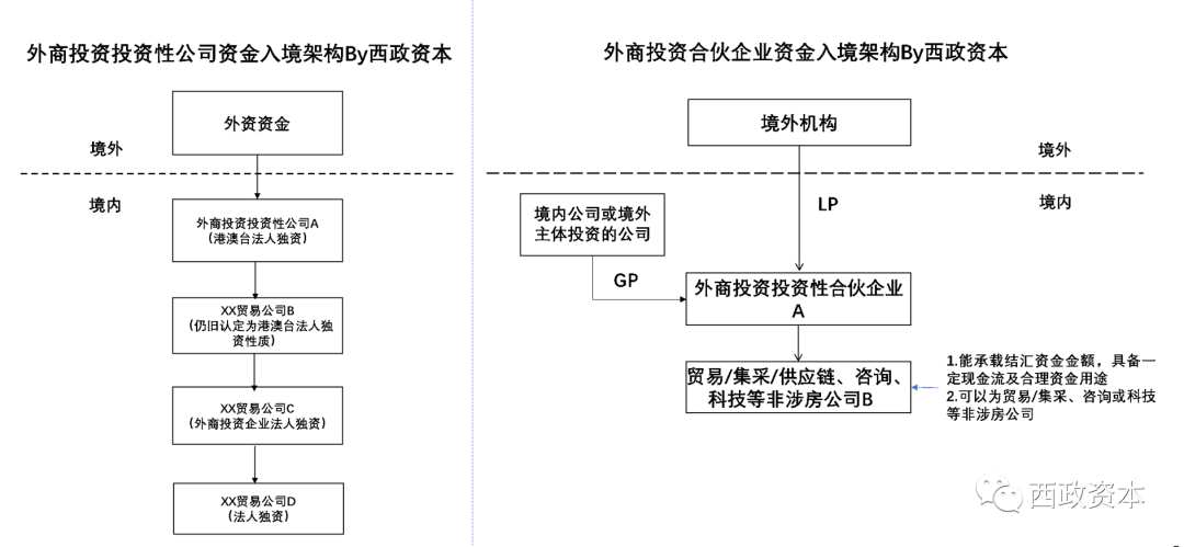 需注意的是,以通過搭建外商投資投資性合伙企業方式進行資金入境時(見上述右圖),需注意下設的B公司需能承載結匯資金金額,比如需具有相應的現金流;企業性質可以為非投資性的貿易/集采/供應鏈類的公司或咨詢、科技類等非涉房公司。