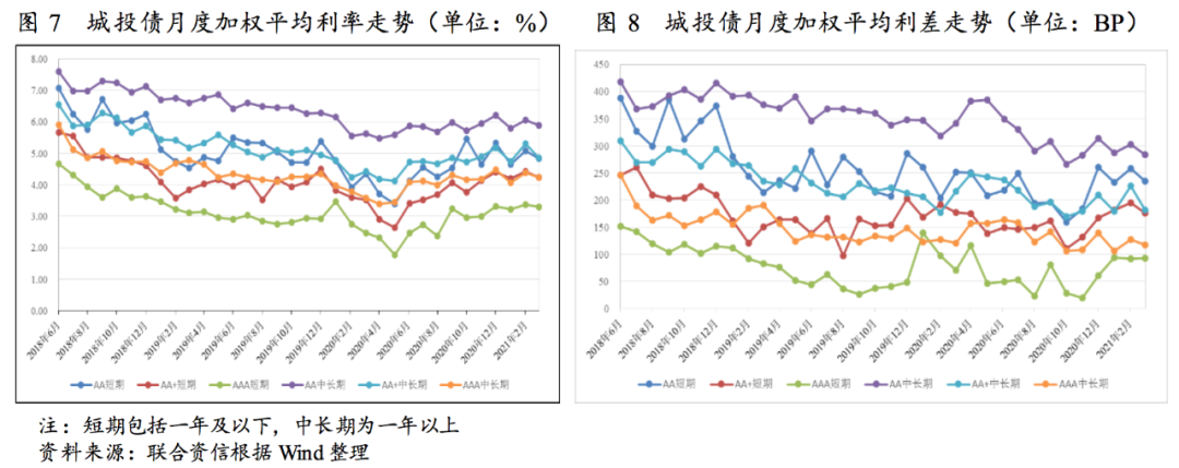 2020年下半年以來,隨著新冠肺炎疫情形勢趨穩(wěn),宏觀經(jīng)濟(jì)穩(wěn)步回升,貨幣政策逐步回歸常態(tài)化,資金面整體有所趨緊。2021年一季度,各級別、期限城投債的發(fā)行利率同比均有所上升。環(huán)比來看,各級別短期城投債的發(fā)行利率環(huán)比均小幅上升,各級別中長期城投債的發(fā)行利率均略有下降,主要是在春節(jié)前后時(shí)點(diǎn)因素以及央行公開市場大規(guī)模凈回籠影響下,2021年初市場流動(dòng)性短暫趨緊、投資者期限偏好呈現(xiàn)分化所致。分月來看,1月,各級別、各期限城投債的發(fā)行利率相對較低,且環(huán)比均有所下降,其中AA級中長期、AA+級中長期和AAA級中長期分別環(huán)比下降0.41個(gè)、0.44個(gè)和0.41個(gè)百分點(diǎn),整體拉低了一季度各級別中長期城投債發(fā)行利率的平均水平;2月,各級別、各期限城投債的發(fā)行利率均明顯上升;3月,各級別、期限城投債的平均發(fā)行利率環(huán)比均有所下降,但整體小幅高于1月的平均水平。一季度,各級別、期限城投債發(fā)行利率呈現(xiàn)先上升后下降的“倒V”形態(tài)。