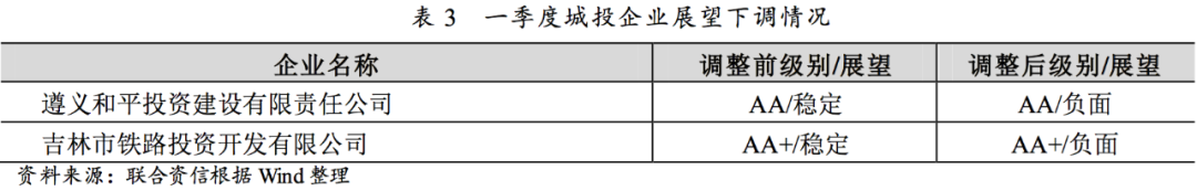 一季度,城投企業(yè)主體級別無調(diào)降的情況。評級展望由穩(wěn)定調(diào)整為負(fù)面的城投企業(yè)2家,貴州省和吉林省各1家,展望下調(diào)原因主要包括區(qū)域融資環(huán)境較差、企業(yè)自身流動(dòng)性壓力較大、新增不良信貸記錄等。