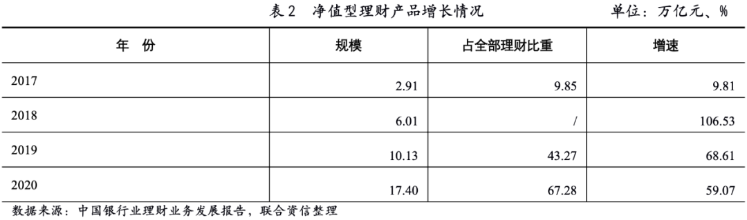 理財產品向凈值化轉型成為重要發展方向。銀行傳統保本理財產品的風險由銀行而并非投資者承擔,理財產品規模的不斷增長使得潛在的剛性兌付壓力日漸增加,并成為制約銀行理財業務發展的主要因素,但資管新規的發布使得理財產品凈值化轉型成為必然趨勢,“剛性兌付”將逐漸被打破。近年來,銀行凈值化理財產品規??焖偕仙?,占全部理財產品的比重增長較為明顯(見表2),理財產品凈值化進程不斷推進。