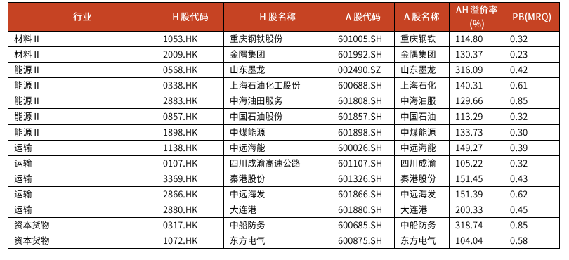表1 A+H股中AH價差較大且估值較低的H股一覽