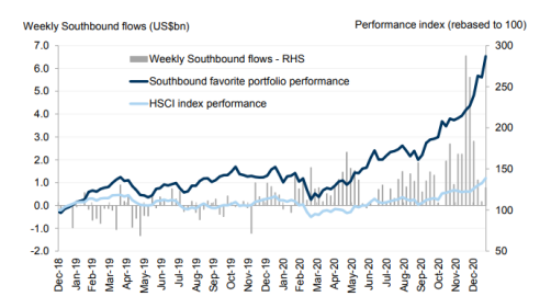 南下資金又稱“南水”,與北上資金即“北水”相對應,主要是指通過港股通賬戶或內地的港股基金投資香港股市的資金。1月以來,南下資金洶涌澎湃,有幾個數據可以佐證內地投資者正在熱捧港股:
