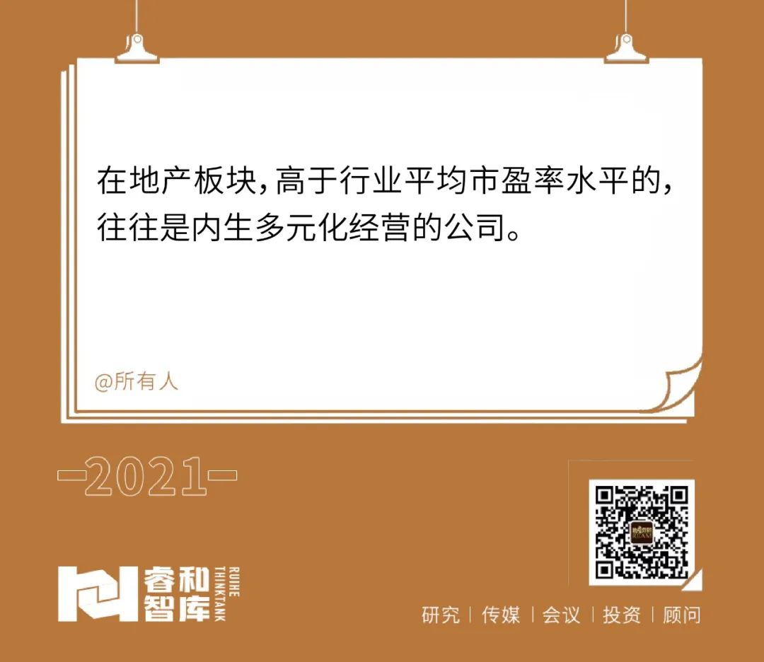 在地產板塊,無論港股還是A股,明顯高于行業平均市盈率水平的,往往是內生多元化經營的公司,最典型的是港股的龍湖集團和A股的新城控股。兩家公司的共同點是經營模式上的雙輪驅動,住宅開發和商業地產經營相輔相成,在投資拿地方面具備攤薄樓面價成本的競爭優勢,在房價受調控限制的周期內,更便宜的地就意味著穿越周期實現盈利增長的空間。