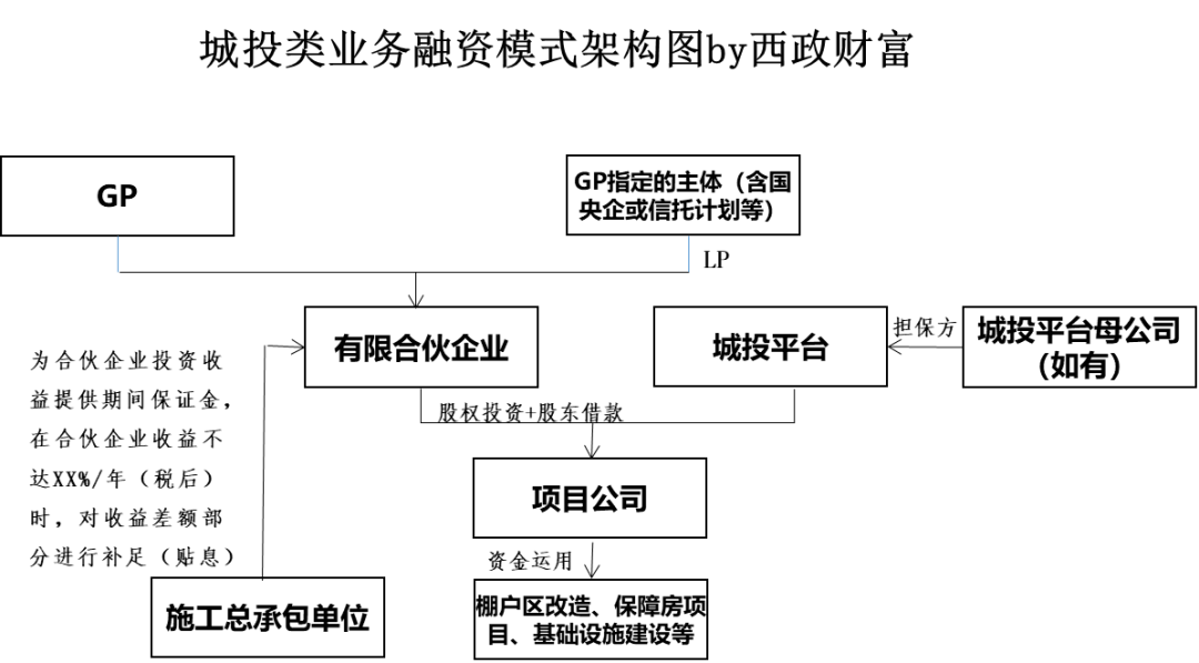 3. 增信擔保措施:施工總包單位對合伙企業(yè)期間收益提供期間保證金,并對合伙企業(yè)期間收益差額部分提供擔保(貼息),城投平臺的母公司提供擔保,項目公司章證照共管。