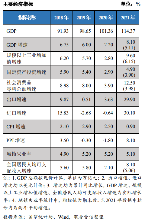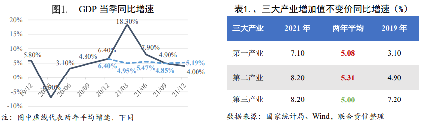 政策回歸常態(tài)化等背景下,我國經(jīng)濟上半年持續(xù)復(fù)蘇,三季度經(jīng)濟增長有所放緩,四季度小幅改善。經(jīng)初步核算,2021年我國國內(nèi)生產(chǎn)總值114.37萬億元,按不變價計算,同比增長 8.10%,兩年平均增長[1]5.11%。分季度來看,GDP 當(dāng)季同比增速在基數(shù)影響下逐季回落。從兩年平均增速來看,上半年我國經(jīng)濟穩(wěn)定修復(fù);三季度 GDP 增速明顯回落,主要受供給端約束和內(nèi)生動能不足的共同影響;隨著保供穩(wěn)價和助企紓困政策有力推進(jìn),供給端限電限產(chǎn)的約束有所改善,四季度經(jīng)濟增長有所加快。