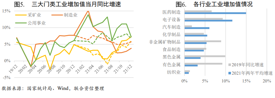 三大門類均實現(xiàn)較快增長。2021年,采礦業(yè)、制造業(yè)以及電力、熱力、燃?xì)饧八a(chǎn)和供應(yīng)業(yè)增加值同比分別增長5.30%、9.80%、11.40%,兩年平均增速分別為2.87%、6.55%、6.60%。主要行業(yè)[2]方面,醫(yī)藥制造業(yè)、計算機、通信和其他電子設(shè)備制造業(yè)以及汽車制造業(yè)受出口帶動2021年工業(yè)增加值兩年平均增速較高,但受芯片、電池等供應(yīng)鏈短缺影響,下半年特別是8月汽車制造產(chǎn)能擴張承壓;而黑色、有色金屬冶煉及延壓加工業(yè)和非金屬礦物制品業(yè)工業(yè)增加值兩年平均增速較2019年下降較大,主要是限電限產(chǎn)等措施對鋼鐵、有色和水泥等高耗能行業(yè)產(chǎn)能負(fù)面影響較大,其中鋼鐵工業(yè)增加值兩年平均增速繼續(xù)下滑,除了供給端的限制外,還受到需求端地產(chǎn)降溫的影響。