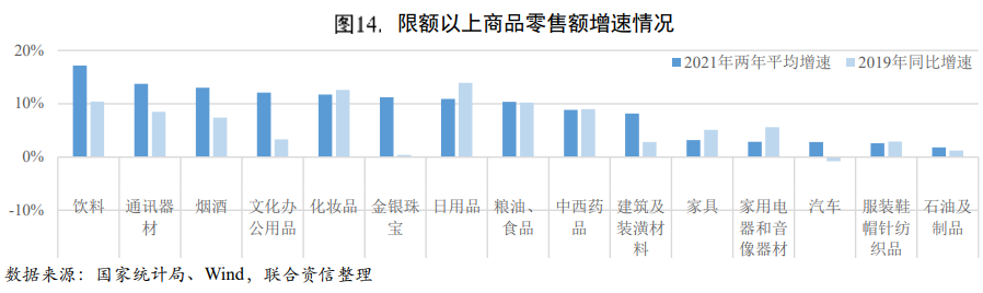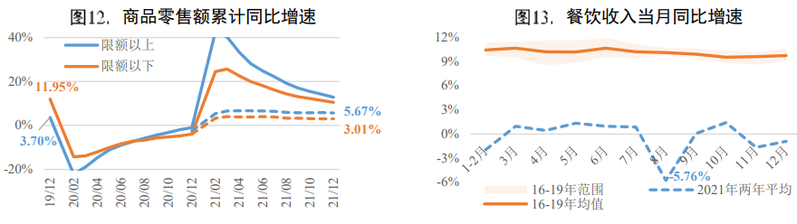 限額以下商品零售和接觸性服務(wù)仍是消費的主要拖累。2021年商品零售額同比增長11.80%,兩年平均增長4.51%,不及疫情前水平(2019年為7.90%)。商品零售與疫情前差距主要體現(xiàn)在限額以下的部分:2021年限額以下商品零售額兩年平均增速僅為3.01%,與疫情前2019年的增速水平(11.95%)相差較大。限額以上商品零售額兩年平均增速均為正值,汽車銷售上半年表現(xiàn)強勢,而自二季度以來受芯片供應(yīng)短缺以及排放標(biāo)準(zhǔn)升級切換期等影響較大,汽車零售額兩年平均增速多次落入負(fù)值區(qū)間。餐飲收入受疫情沖擊較大,2021年餐飲收入同比增長18.60%,兩年平均下降0.55%,餐飲消費規(guī)模仍不及疫情前水平。餐飲收入等接觸性消費由于對疫情變化更為敏感,整體波動較大且較疫情前水平差距較大,仍有較大的恢復(fù)空間。