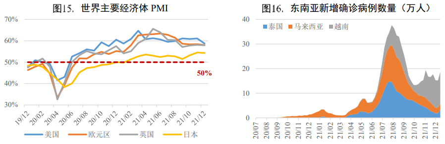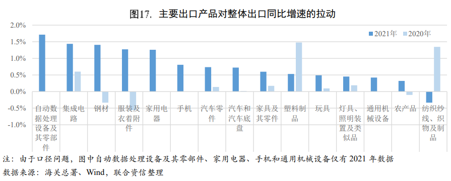 海外產(chǎn)需缺口、出口替代效應(yīng)以及低基數(shù)等因素支撐我國出口高增長。2021年主要經(jīng)濟體PMI高位運行,全球經(jīng)濟持續(xù)恢復(fù),海外需求旺盛但產(chǎn)需依然存在較大缺口,加之東南亞疫情反復(fù)導(dǎo)致的出口替代作用,共同支撐我國出口維持高景氣度。但海運領(lǐng)域出現(xiàn)的集裝箱運力緊張、運價高漲問題對出口產(chǎn)生了一定的負(fù)面影響。三季度以來出口價格上漲對出口金額的貢獻(xiàn)度上升,集成電路、手機和家用電器等受大宗商品漲價明顯的行業(yè),出口均表現(xiàn)出量減價增的特點。從主要出口產(chǎn)品對整體出口同比增速的拉動來看,自動數(shù)據(jù)處理設(shè)備及其零部件、集成電路依然是出口的最大拉動項;紡織紗線、織物及制品由于上年基數(shù)較高,對出口造成負(fù)向拉動。