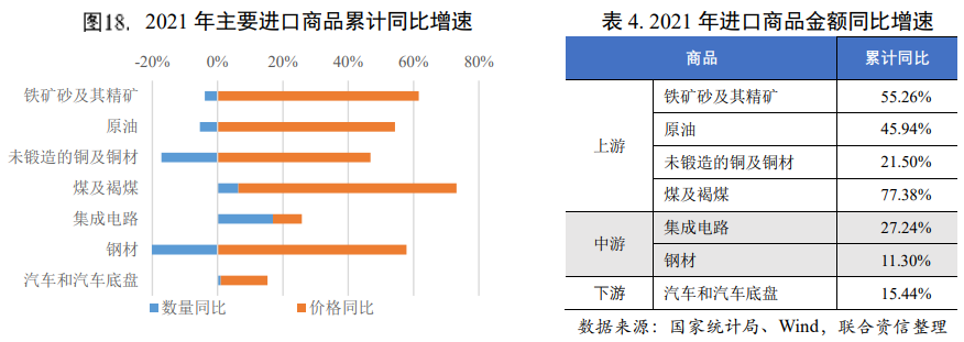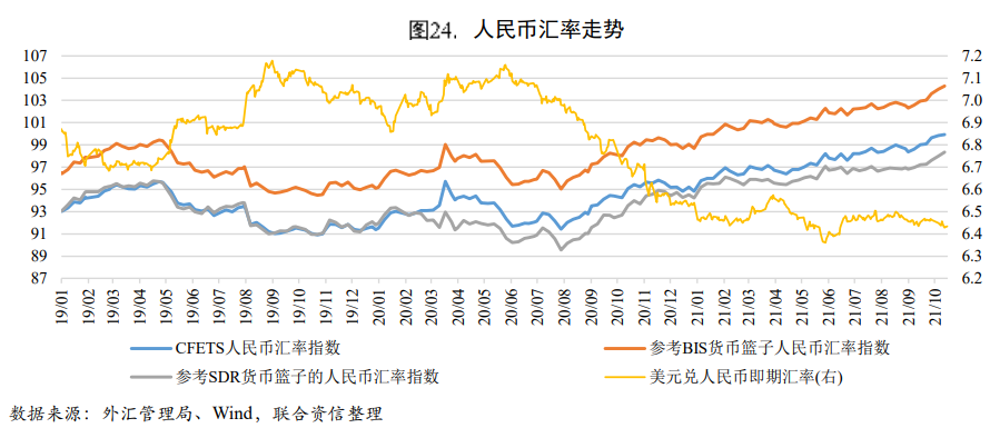 國際大宗商品漲價、人民幣升值等多重因素帶動進(jìn)口金額增長。價格因素支撐主要進(jìn)口商品金額高增長:鐵礦砂及其精礦、原油和未鍛造的銅及銅材、煤及褐煤、鋼材以及汽車和汽車底盤進(jìn)口金額增長主要由價格大幅增長拉動;僅集成電路的數(shù)量增速高于價格增速,表明數(shù)量因素對金額增長的貢獻(xiàn)大于價格拉動。多數(shù)商品呈現(xiàn)量減價揚的特點,國際大宗商品價格的上漲抑制了部分國內(nèi)需求。此外,2021年以來人民幣匯率三大指數(shù)同步提升,人民幣升值一定程度上也對擴大進(jìn)口產(chǎn)生了積極作用。
