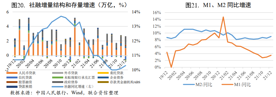 2021年,社融增速整體呈現(xiàn)高位回落的態(tài)勢,貨幣供應(yīng)量、社會融資規(guī)模的增速與名義經(jīng)濟增速基本匹配。截至12月末,社融存量余額為314.13萬億元,同比增長10.30%,比2020年末低3個百分點。2021年新增社融規(guī)模31.35萬億元,其中人民幣貸款是主要支撐項;政府債券同比大幅下降,但顯著高于2019年水平,發(fā)行錯期效應(yīng)使得政府債券支撐社融增速在年底觸底回升;企業(yè)債券融資同比大幅下降,與2019年同期基本持平,企業(yè)債券的融資回歸常態(tài);非標(biāo)融資規(guī)模大幅壓降,是拖累新增社融規(guī)模的主要因素。
