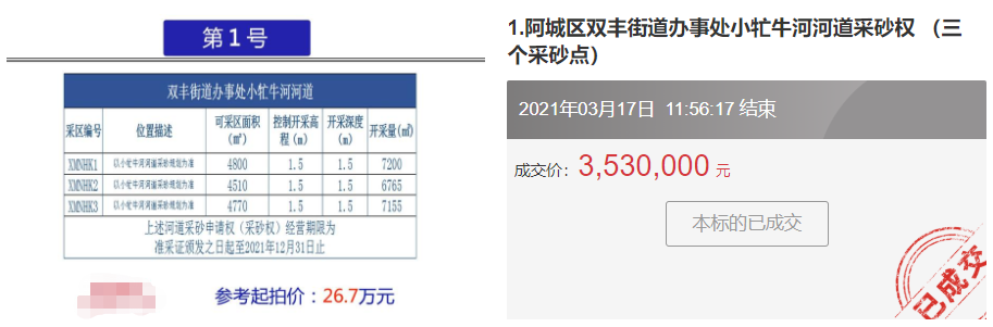 本標的是位于哈爾濱市阿城區雙豐街道辦事處小牤牛的河河道采砂權,其起拍價格為267,000元,歷經2小時的激烈競價之后以3,530,000元的價格成交,實現了3,263,000元的溢價,溢價率高達1200%。這般激烈競價,真是讓人大開眼界!