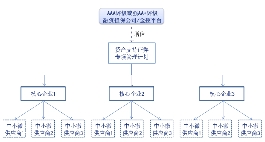 “1+N+N”模式(其中:“1”是指金控平臺(tái)/擔(dān)保公司牽頭發(fā)起的資產(chǎn)管理計(jì)劃,“N”是指具有延長(zhǎng)應(yīng)付賬款需求的N戶核心企業(yè),“N”是指供應(yīng)鏈中的N個(gè)中小微企業(yè))是以中小微企業(yè)與核心企業(yè)的真實(shí)交易為基礎(chǔ),將中小微企業(yè)對(duì)核心企業(yè)的應(yīng)收賬款作為基礎(chǔ)資產(chǎn)打包成資產(chǎn)管理計(jì)劃進(jìn)行證券化發(fā)行。金控平臺(tái)/擔(dān)保公司發(fā)揮自身主體評(píng)級(jí)優(yōu)勢(shì),為核心企業(yè)的應(yīng)付賬款提供增信支持,提高項(xiàng)目的信用評(píng)級(jí)和發(fā)行成功率。