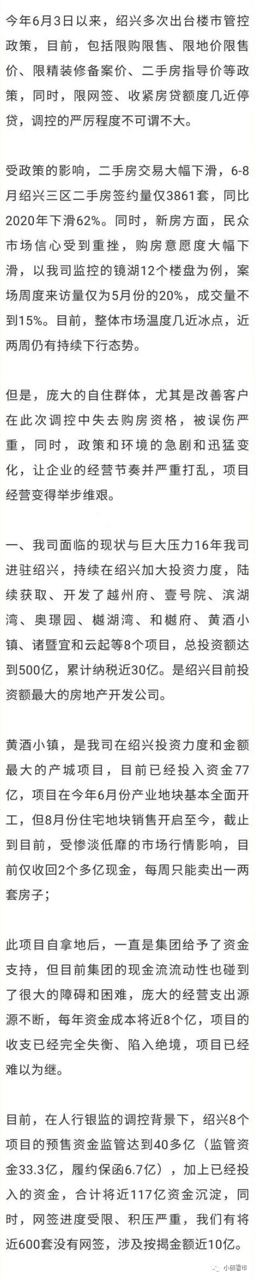 值得注意的是,信中稱不僅融創紹興公司面臨巨大壓力,融創集團的流動性也碰到了很大的障礙和困難,難以持續撥款支持地方項目。