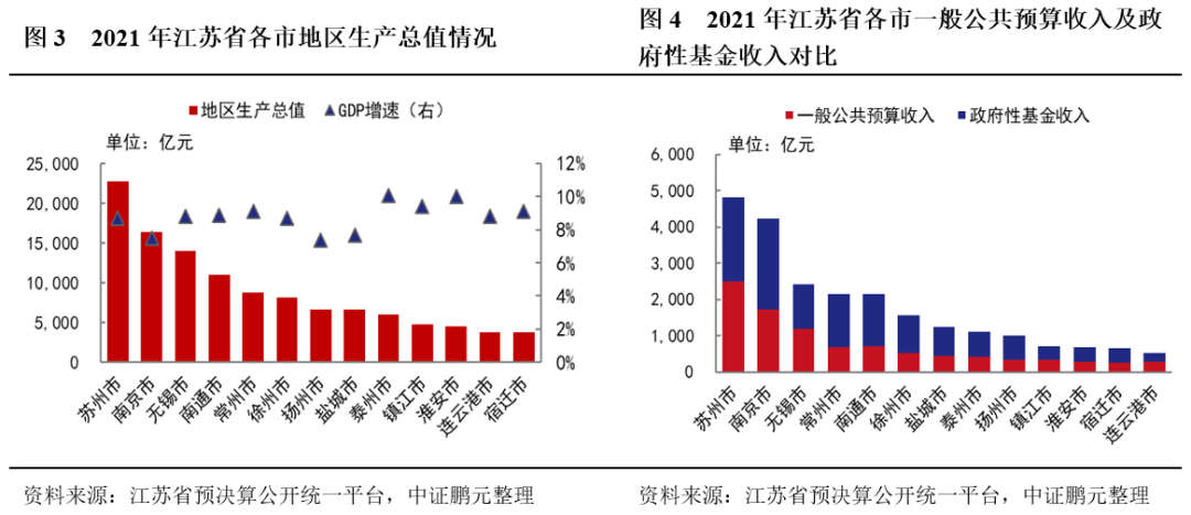 從全省情況來看,江蘇省經濟財政實力依然位居全國前列。2021年,江蘇省實現GDP總量11.64萬億元,人均GDP13.70萬元,是全國人均GDP的169.23%;且近年產業結構持續轉型升級,工業實力雄厚,上市公司數量居全國第三,經濟發展活力較強。財政方面,2021年全省實現一般公共預算收入10,015.2億元,政府性基金收入13,632.95億元,分列全國第2和第1。雖然江蘇省廣義債務率處于全國較高水平,但其經濟財政實力雄厚,且產業結構合理,短期內可對債務償還形成有力支撐。