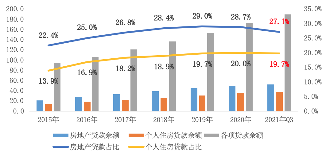 2021年三季度末,全國房地產貸款余額51.4萬億元,占各項貸款余額的比重進一步回落至27.1%,較2020年末再降1.6個百分點。其中,個人住房貸款余額37.4萬億元,占各項貸款余額的比重跌至19.7%,較2020年末減少0.3個百分點。