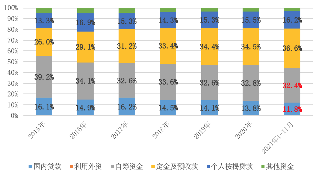 據統計數據顯示,2021年1-11月,房地產開發企業到位資金183362億元,同比增長7.2%。其中,國內貸款、自籌資金占比分別跌至11.8%和32.4%,較2020年末分別減少2個百分點和0.4個百分點。反觀定金及預收款、個人按揭貸款占比分別升至36.6%和16.2%,較2020年末分別增加2.2個百分點和0.6個百分點。說明國內貸款、自籌資金增長顯著受限,定金及預收款、個人按揭貸款漸成房企最為重要的資金渠道來源,企業對銷售回款的依賴度持續提升。