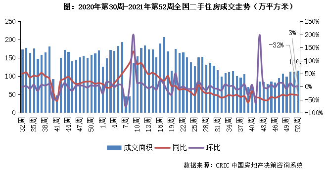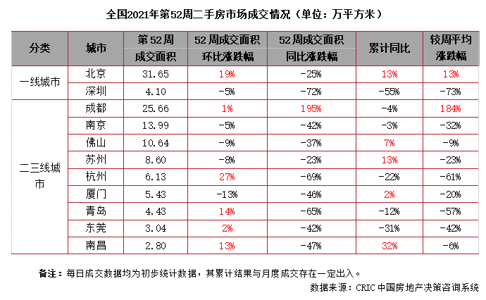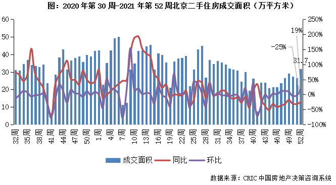 2021年第52周,北京二手房成交面積為31.7萬平方米,環比增長19%,較去年同期降幅收窄至25%。本周北京市場回調后再次上揚至下半年新高,年末市場放量后續或持續穩中有升。
