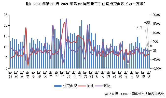2021年第52周,蘇州二手住房成交面積環比跌8%至8.6萬平方米,同比下跌23%。本周市場規模持續小幅震蕩回落,基于政策尚未有放松跡象,后續市場或震蕩企穩。