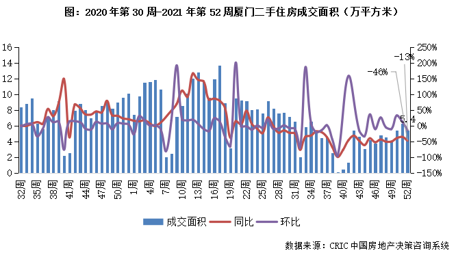 2021年第52周,廈門二手住房成交面積環比降13%,同比跌幅擴大至46%,成交規模收5.4萬平方米。下半年以來成交規模波動下行,近3周市場成交規模有所放量且較前期高點仍有上升空間,后市或持續震蕩回升。