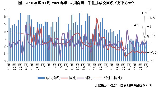 2021年第52周,南昌二手住房成交規模收2.8萬平方米,環比增長13%,同比跌幅收窄至47%。“房地產稅”相關政策出臺致樓市再降溫,本周市場成交小幅回升但規模仍處低位,短期內仍將在當前規模震蕩。