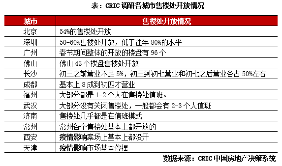 線下售樓處開放率偏低,并且多數都以2-3人值班為主。根據CRIC調研數據,深圳僅有50%-60%左右售樓處開放,相較往年的80%有明顯下滑,北京疫情突襲,售樓處開放率也僅有54%。武漢、福州、濟南等雖然未關閉售樓處,但也只有2-3人值班,保證最基本的接待能力。長沙、成都等地春節期間大部分都直接放假,直到年后才恢復正常開放。而天津和西安由于疫情影響,整個1月連帶春節基本都處于停擺狀態,線下售樓處開放程度很低。