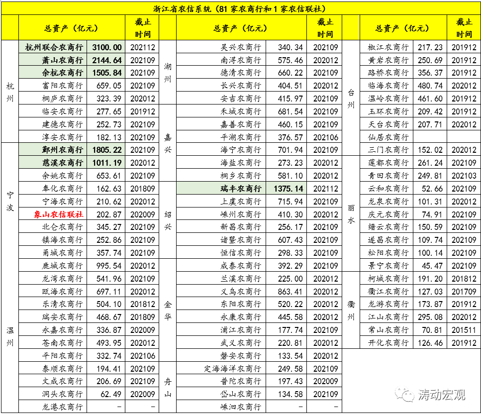 目前浙江省農(nóng)信系統(tǒng)共有82家成員,包括81家農(nóng)商行和1家農(nóng)信聯(lián)社(即象山農(nóng)信聯(lián)社),目前82家成員的總資產(chǎn)規(guī)模合計(jì)達(dá)到4萬(wàn)億左右,其中總資產(chǎn)超過(guò)1000億元的成員有6家,從高到低依次為杭州聯(lián)合農(nóng)商行、蕭山農(nóng)商行、余杭農(nóng)商行、鄞州農(nóng)商行、慈溪農(nóng)商行和瑞豐農(nóng)商行(已成為A股上市銀行)。