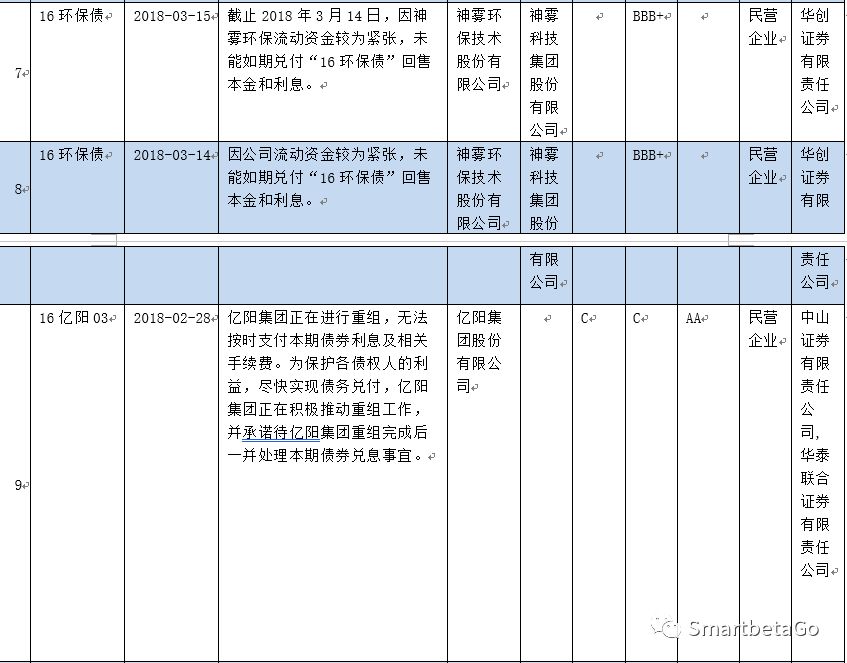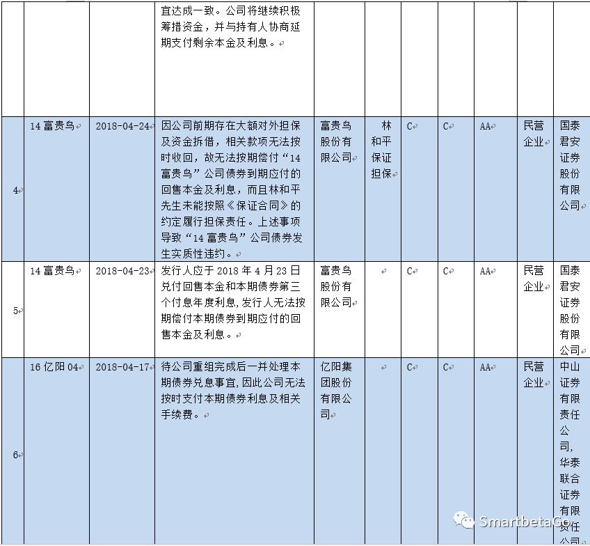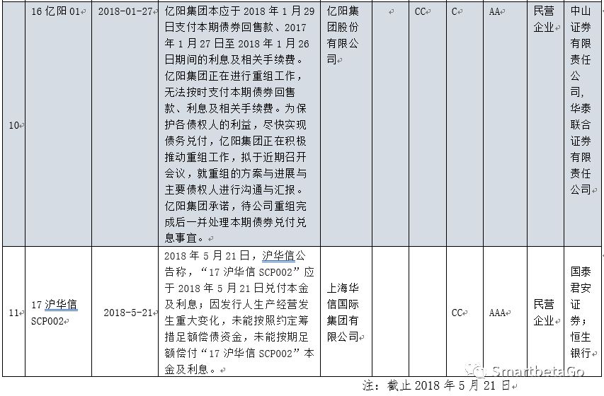 2018年以來新增違約債券21只,其中6家公司為新增違約主體,分別為:富貴鳥股份股份有限公司、凱迪生態環境科技股份有限公司、神霧環保技術股份有限公司、億陽集團股份有限公司、中安消股份有限公司、上海華信國際集團有限公司,其中上海華信國際集團有限公司是首個違約的AAA級發債主體。