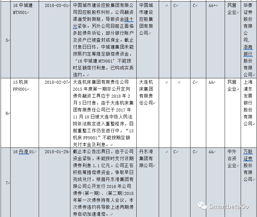 2014年“11超日債”利息未完全兌付以來,信用債實質性違約的常態化已不可避免。2015年債券違約波及的品種及類型擴大:湘鄂情、珠海中富等上市公司的債券違約;中鋼、天威等國企的債券違約;山水水泥發行的超短融違約。2016年諸多產能過剩行業的債券違約爆發,如中煤華昱、淄博宏達、廣西有色、東北特鋼、川煤集團等。2017年新增違約主體主要系民營企業,如五洋建設、丹東港、億利集團等。