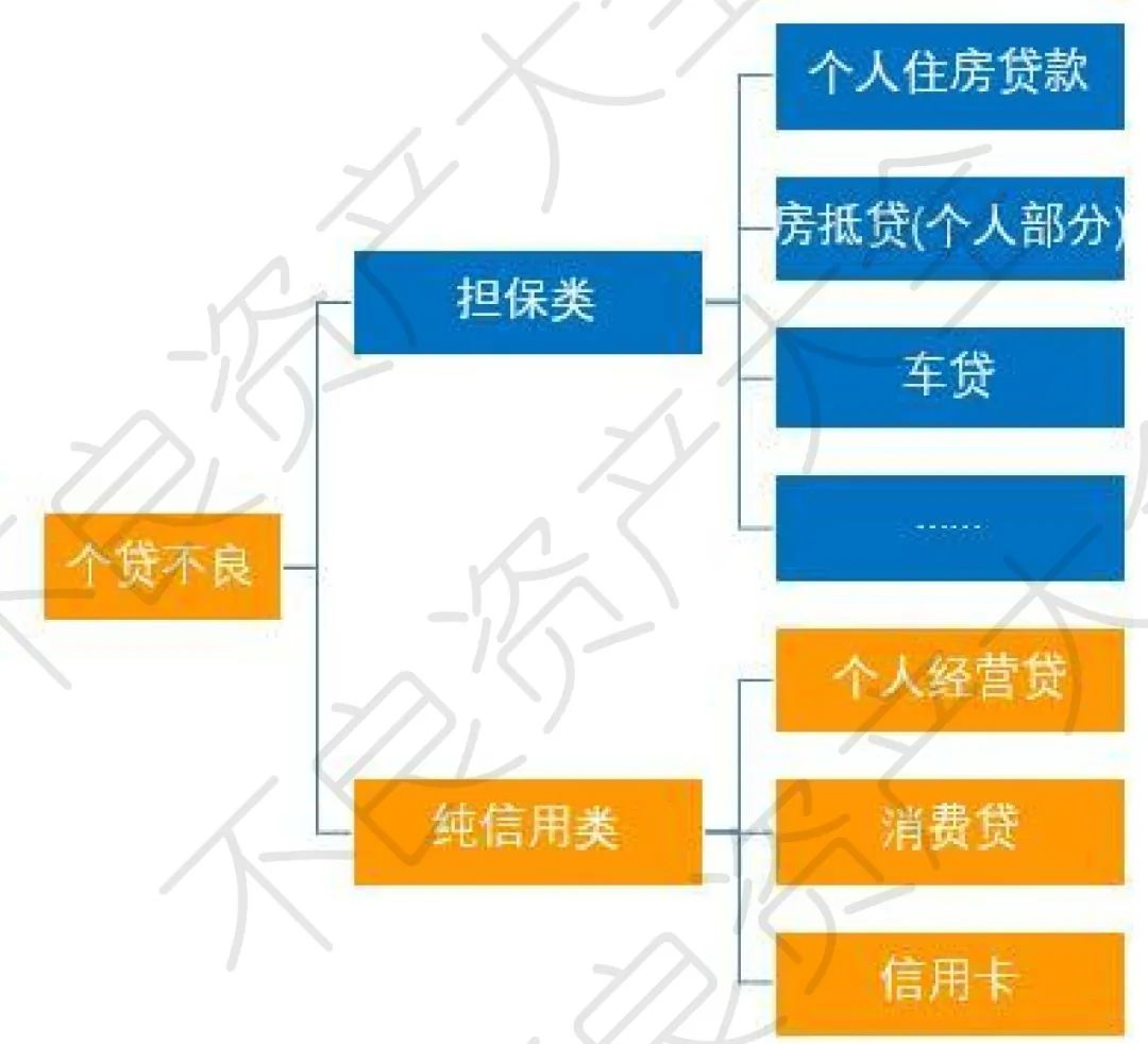 銀保監會于2021年1月7日發布的《關于開展不良貸款轉讓試點工作的通知》(以下簡稱《通知》)實際上開放的是銀行業純信用類個貸不良,即上圖中黃色部分。當然,對于非銀債權人則不受《通知》限制,總體上除了個人住房貸款以外都可以參與。
