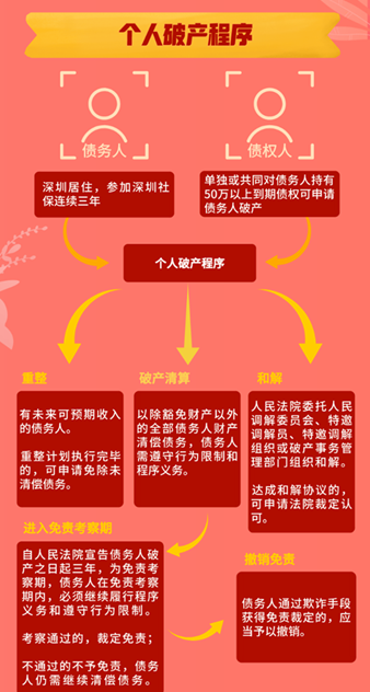 值得強調的是,在深圳居住且連續參加深圳社保滿三年的債務人本人,單獨或者共同對上述債務人持有五十萬元以上到期債權的債權人,或上述債務人的配偶(在債務人/債權人申請債務人破產時同時為自己申請)有資格申請破產。