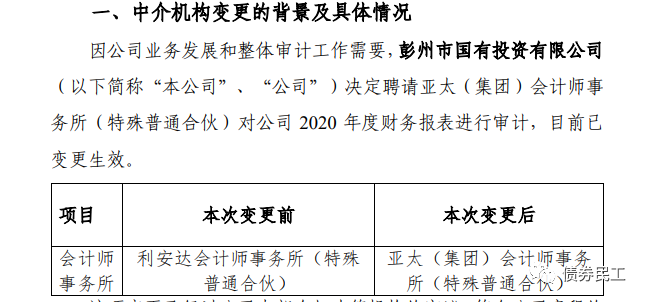 3、彭州市國有投資有限公司2021年4月30日公告,決定聘請亞太(集團)會計師事 務所(特殊普通合伙)對公司 2020 年度財務報表進行審計。