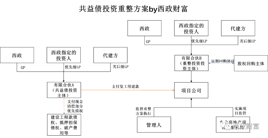 需注意的是,如果按常規操作繼續以債權的形式向項目公司注入資金,則我們這個繼續進入的普通債權在法律層面無法得到充分的保障,因此就程序上的操作來說,在項目公司破產申請被受理后,我們的資金以共益債權的方式完成進入才能更好地確保我們自身的投資安全(參見下述融資架構)。