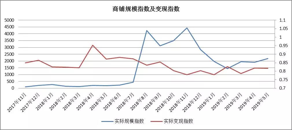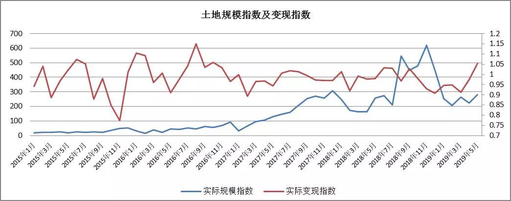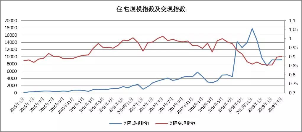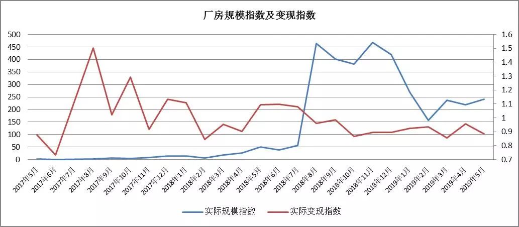 趨勢分析:工業用房成交量在 2018年8月與11月規模激增,之后開始下降,至2019年3月有所增加,4月、5月總體平穩;工業類房產的變現指數自2018年5月以來顯著持續下滑,仍有下滑趨勢。