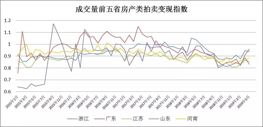 廣東省的房產類拍賣月度平均變現折扣率則呈現出先上升、后下降的走勢,從2015年12月開始震蕩下行,2019年1月起有小幅度回升,短周期內波動較為明顯。
