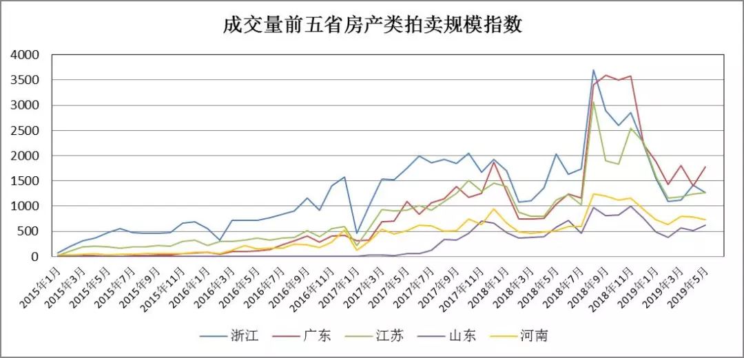 從各省房產類拍賣成交規模來看,整體上廣東、江蘇、浙江三省領跑全國,成交量峰值均在單月3000筆以上,其中浙江省2018年8月成交3708筆,創下目前最大單月成交量。各省規模指數走勢與全國走勢基本一致。從2015年初到2017年底為快速增長期,其后經歷了一次低谷,到2018年下半年開始沖擊新高,此后的走勢有所分化,浙江省、江蘇省、山東省經歷了劇烈波動后開始下滑,廣東省、河南省則在高位持續半年后開始快速下滑,隨后趨于平穩。